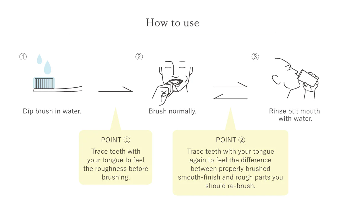 You can feel the smooth finish on the surface of the teeth brushed properly, and roughness on parts not brushed properly. Feel the difference between before and after brushing with a MISOKA toothbrush.